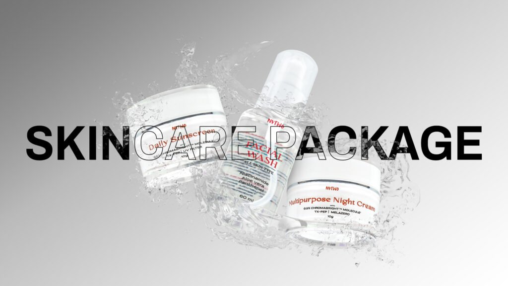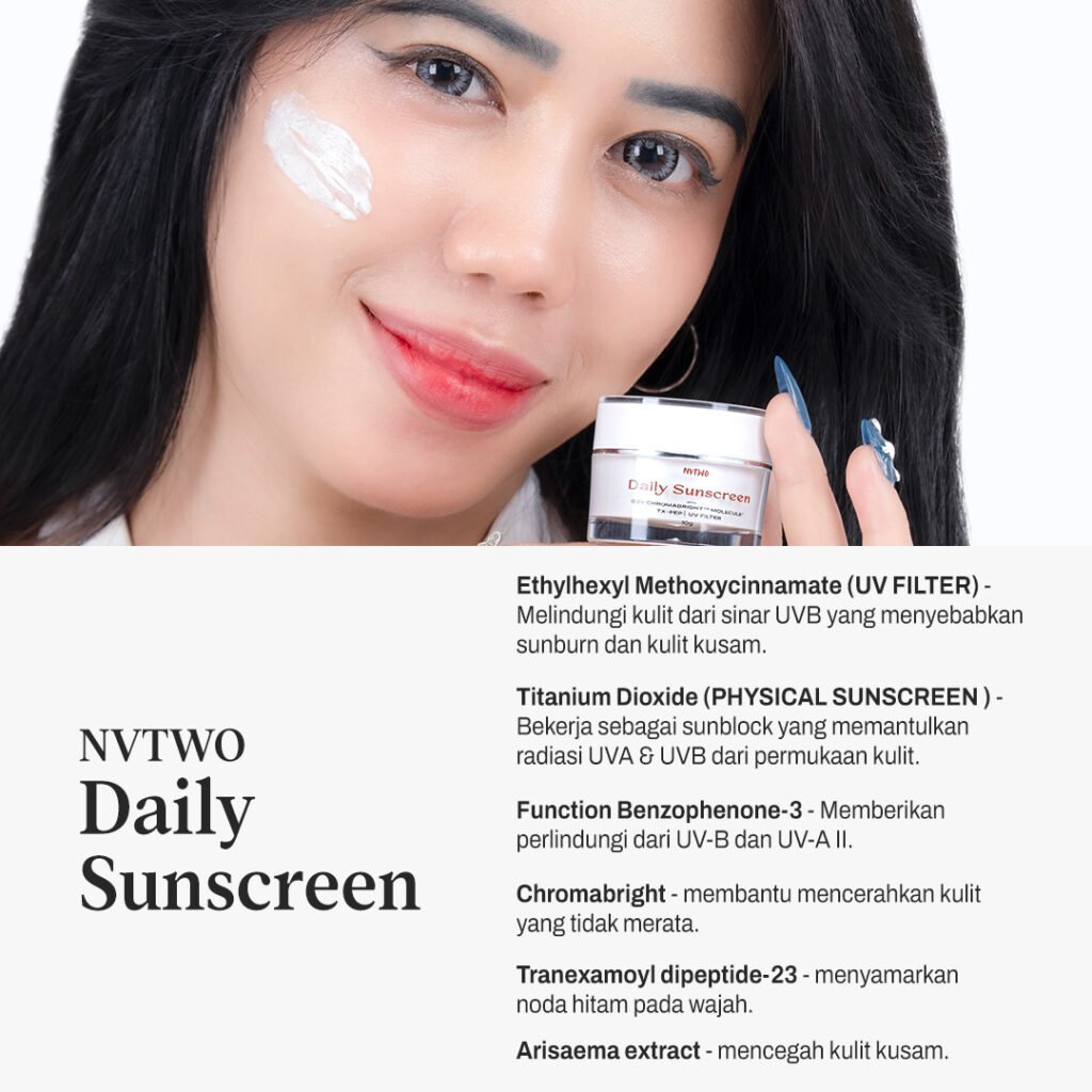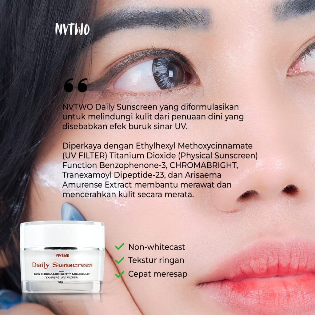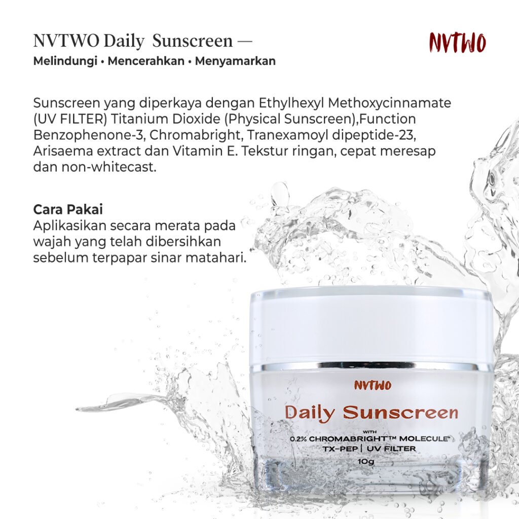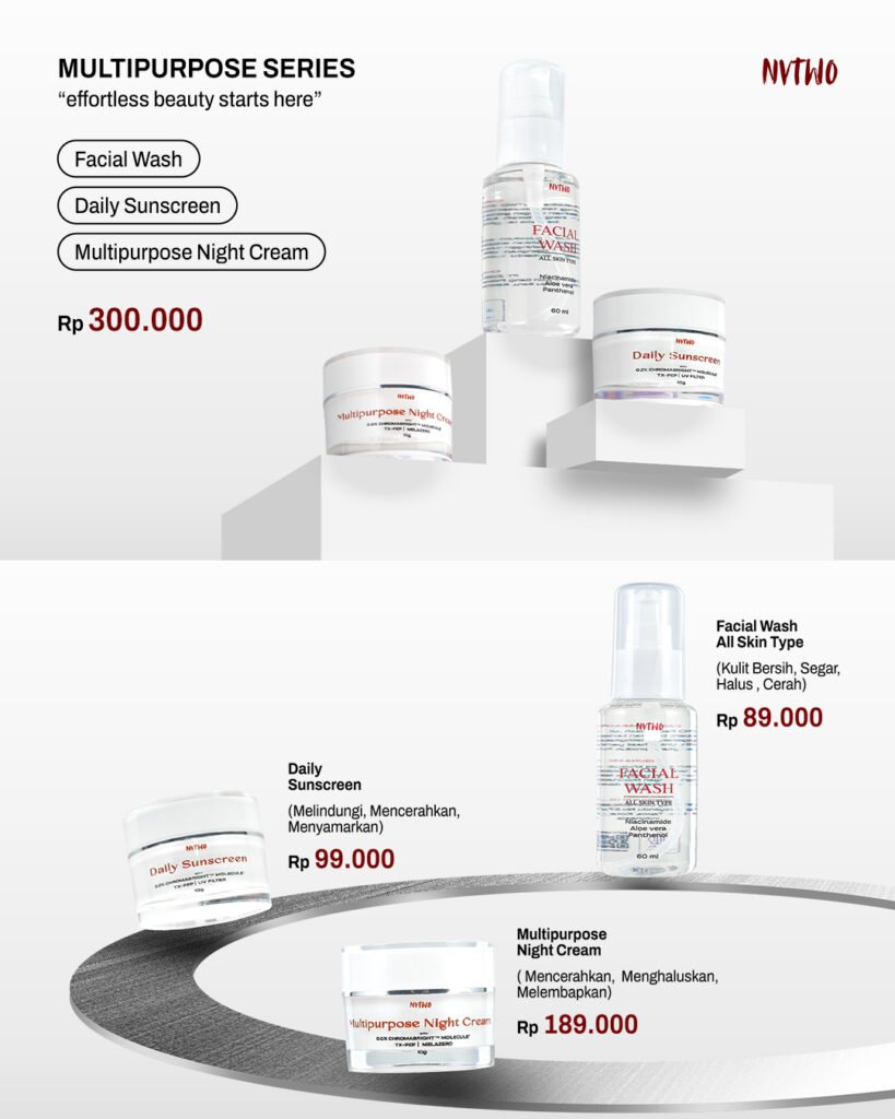NVTWO Skincare Series Package diformulasikan khusus untuk membantu mencerahkan wajah, melembabkan, mengangkat kotoran & sel kulit mati, menutrisi kulit, mencegah penuaan dini & jerawat serta melindungi kulit wajah dari paparan sinar matahari.